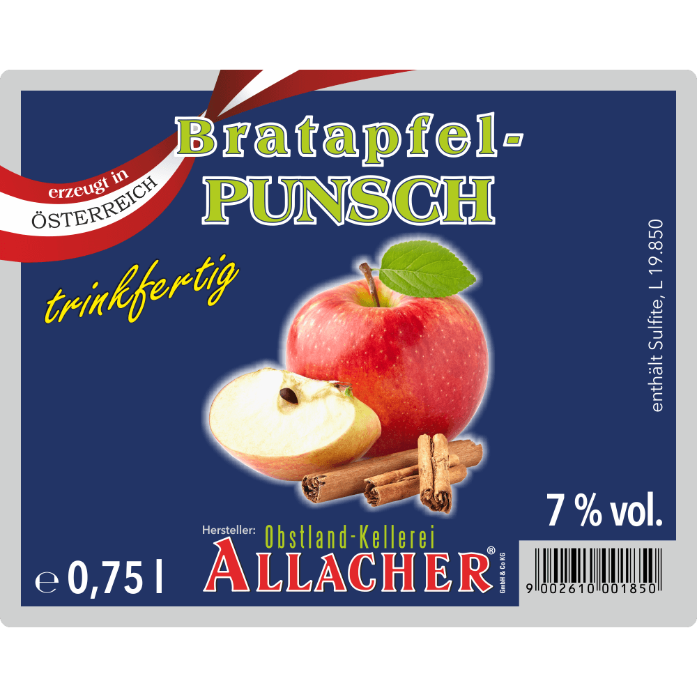 Dieser einzigartige Punsch verbindet fruchtigen Apfelsaft mit unserem hauseigenen Obstwein. Zimt und Nelken verleihen ihm seinen unverwechselbaren weihnachtlichen Geschmack, während karamellisierter Zucker nicht nur für die feine Süße, sondern auch für den typischen Bratapfel-Duft sorgt. Schon der erste Schluck lässt Sie glauben, in einen Bratapfel zu beißen.