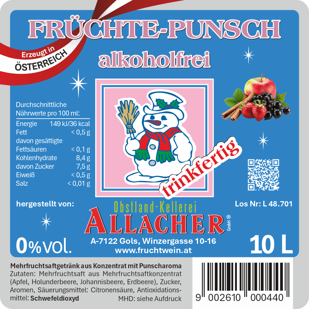 | Servierempfehlung | Auf 60° C erhitzen und sofort servieren. Bitte beachten: Der Punsch darf NICHT kochen (Qualitätsverlust!) |