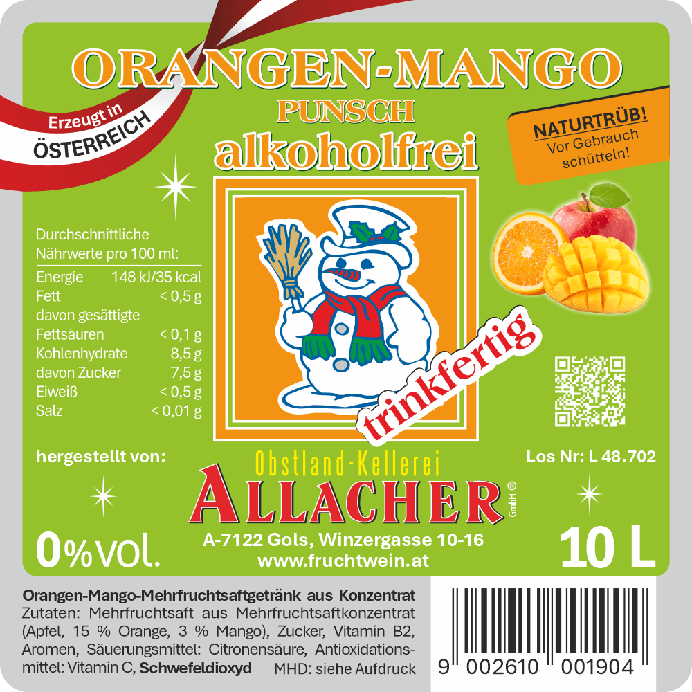 Unser alkoholfreier, naturtrüber Orangen-Mango-Punsch überzeugt durch seinen tropischen Geschmack mit einem Hauch von Bitterorange und ist ideal für alle, die etwas Besonderes lieben.