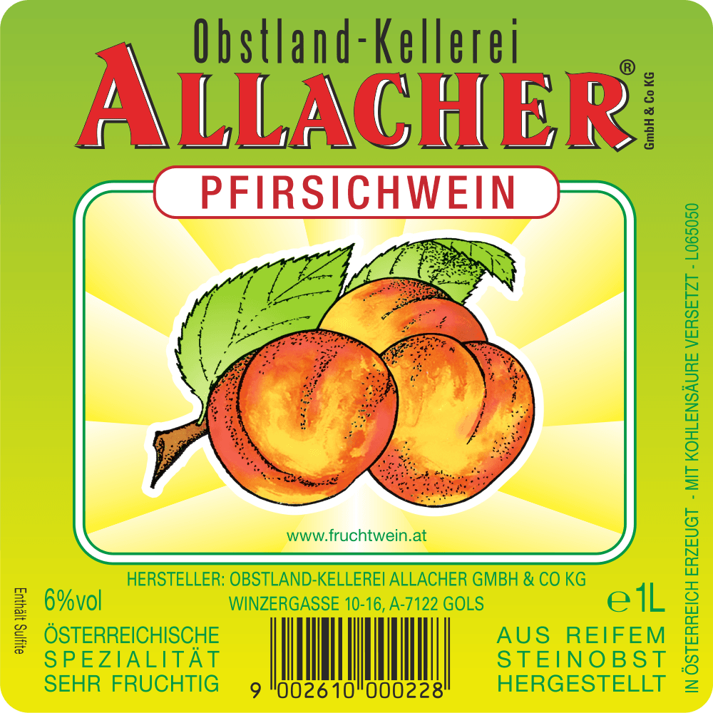 Summer time is summer wine time and which wine could fit better than our peach wine with only 6% alcohol. Made from pure peach juice of the best native, yellow-fleshed, aromatic varieties that have matured under many hours of sunshine. The unmistakable scent and taste of the peach are preserved through gentle processing, so only the pure liquid fruit comes into the bottle. An unmistakable taste sensation with an elegant finish.