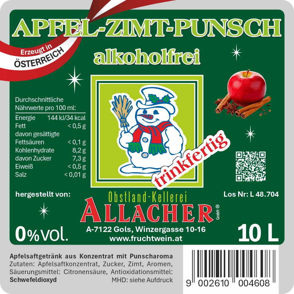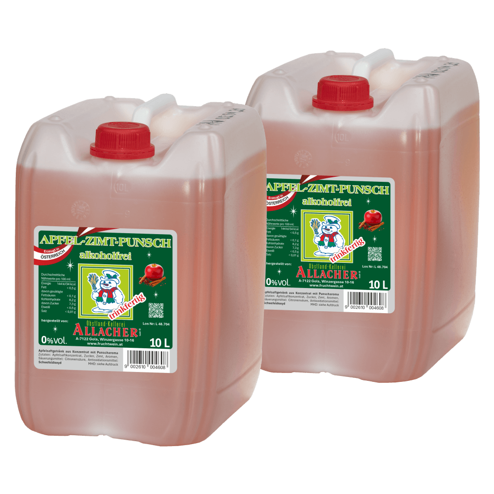 | Zutaten | Apfelsaftgetränk aus Konzentrat mit Punscharoma - Zutaten: Apfelsaftkonzentrat, Zucker, Zimt, |