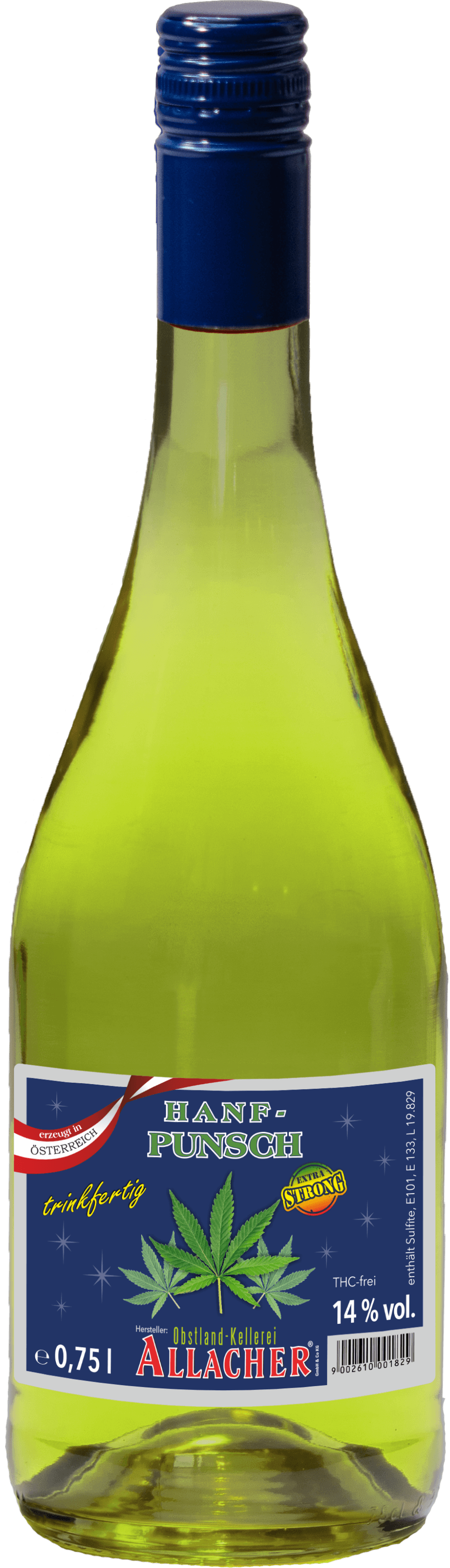 | Zutaten | gehaltvoller Dessertwein mit Hanfaromen, Apfelsaft, Zucker, Vitamin B2 und Gewürzkomponenten |