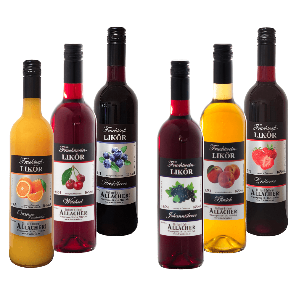 | Paketinhalt | je 1 Flasche 0,7l Orangenlikör naturtrüb, Erdbeerlikör, Heidelbeerlikör, Johannisbeerlikör, Weichsellikör, Pfirsichlikör |